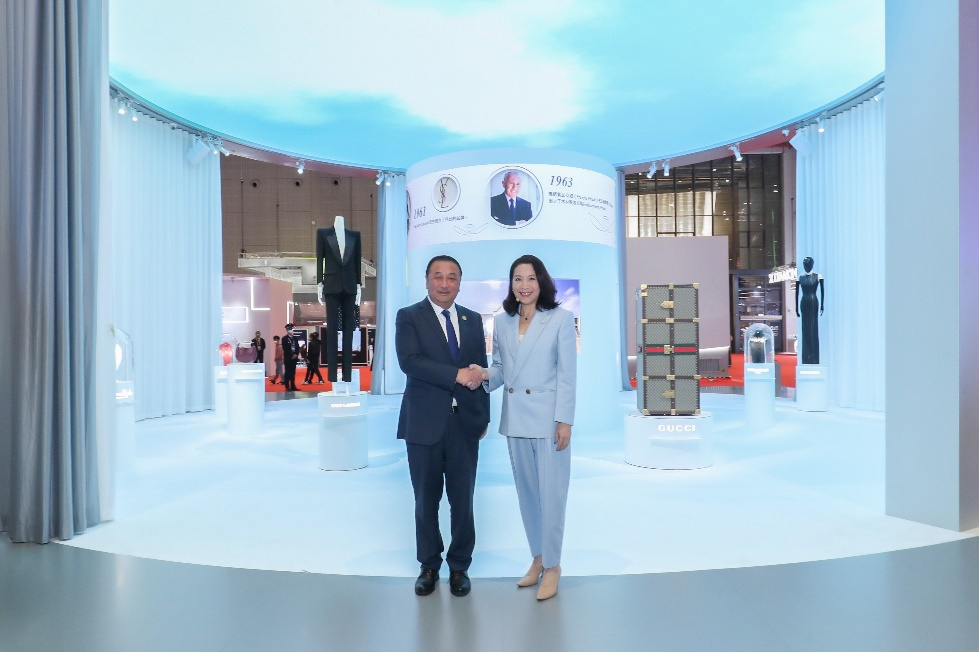 图片说明:中国国际进口博览局副局长孙成海先生,开云集团大中华区总裁蔡金青女士共同见证开云馆启幕。 本届开云馆的建造过程中运用了大量租赁的模块化元素和设备,堪称循环利用典范。其设计化繁为简,力求简洁之美,以方寸之地编织可持续时尚未来。“开云见日,美美与共”亦贴切呼应了开云集团可持续发展价值观。 连续两年作为进博会可持续时尚及生活方式专委会年度委员会会长单位,开云集团于11月7日助力专委会第二届行业论坛。会议将聚焦“循环之美,相融共生“的主题,邀请相关政策制定的领导与专家、国内外实践与创新的企业代表参会,探讨如何通过绿色消费变革促进循环经济发展。 2022年进博会“开云馆”展馆位置: Hall 5.2 Booth B4-01,上海市青浦区崧泽大道333号国家会展中心 展品介绍 GUCCI