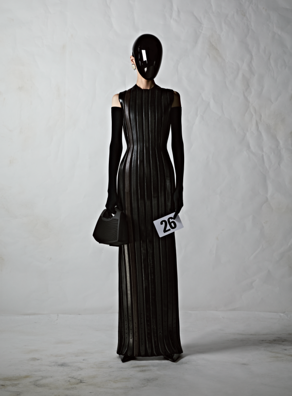 展品:Balenciaga第51季高级定制系列,第26套造型 巴黎世家(Balenciaga)甄选2022年7月在巴黎高级定制沙龙上展示的最新高定系列中的一条晚礼裙。品牌自1917年创立以来,一直将创新作为其关键词。创新、严谨和精湛工艺是巴黎世家的美学追求。如今,品牌也将环保意识融入了创作。这条长裙正是由精心挑选而来的皮带经过错综复杂的拼接,而成为全新单品。当它被赋上盔镜,一种创新的未来主义精神油然而生,传递出积极而富当代感的信号。 ALEXANDER MCQUEEN